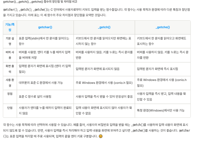 (중요!)getchar(),_getch(),_getche() 함수들의 차이점 표로 나타내기.