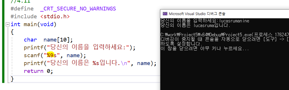(중요!) 내가 입력을 많이할떄 scanf("%9s",name")로 하면 오류 안남. 방을 10으로 설정했기에 방중 하나는 null(0) 이 있으니 자릿수를 9자리를 최대로 설정한다.