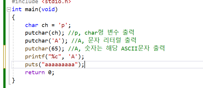 문자나 문자열을 쓸떄는 printf보단 (너무 광범위한 함수) putchar,puts 이 함수를 쓰는것을 추천.