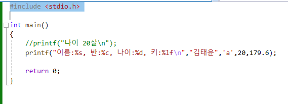 printf("이름:%s, 반:%c, 나이:%d, 키:%lf\n","김태윤",'a',20,179.6);
