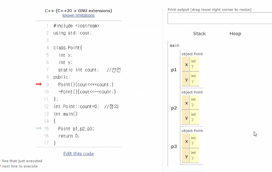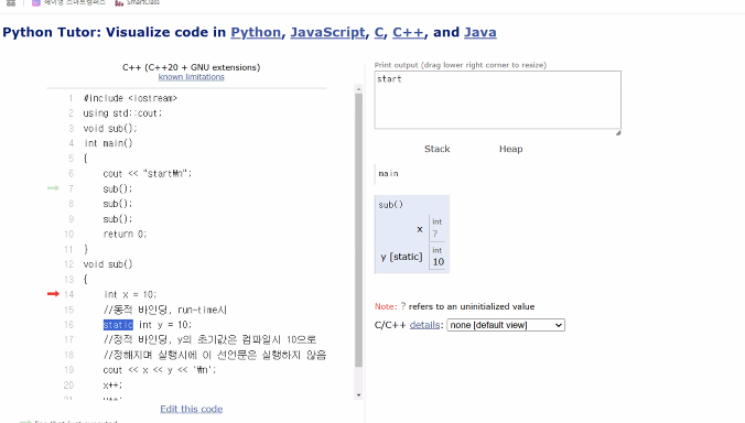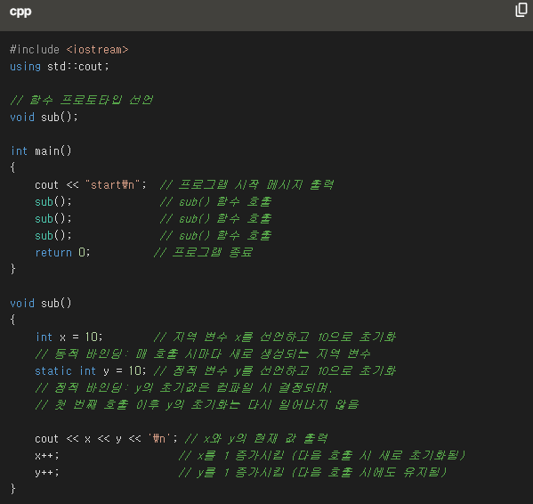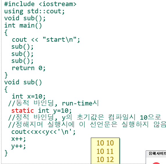 값 할당되는것이 아니다. x는 지역변수쪽이 끝날때 사라지는데, y는 컴파일에 있기떄문에 사라지지 않고, 점점 쌓이게 된다. #include <iostream>