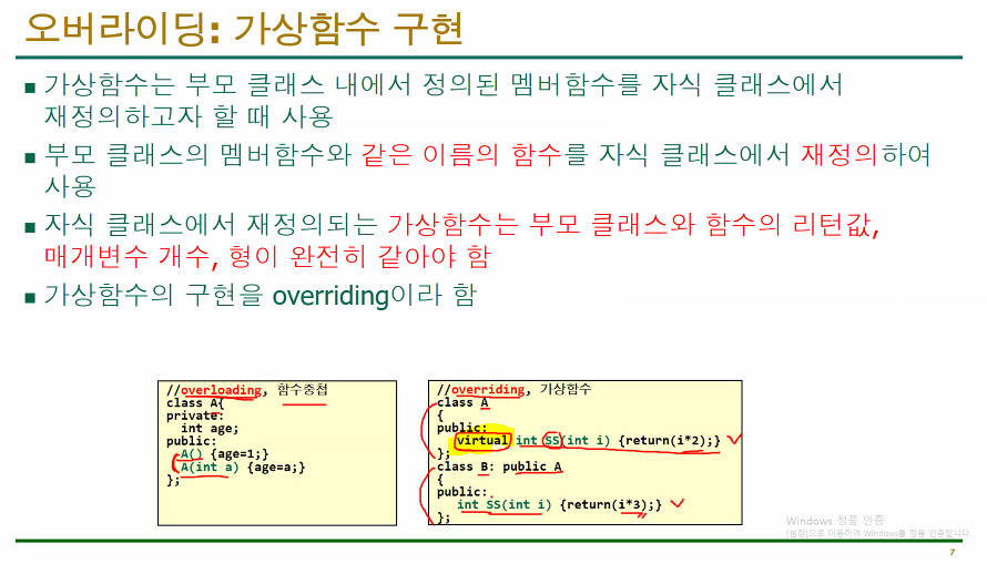 부모와,자식이 함께있을떄 부모를 실행하지말고, 자식을 우선실행하는것을 오버라이딩 이라고하고, 이떄 가상함수가 필ㅇ하다.(virtual function) 다른언어에서도 객체지향이라면 다쓴다.