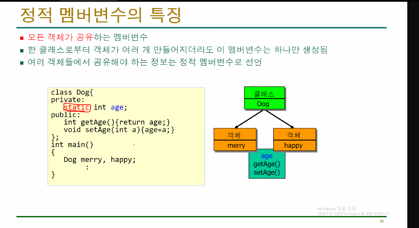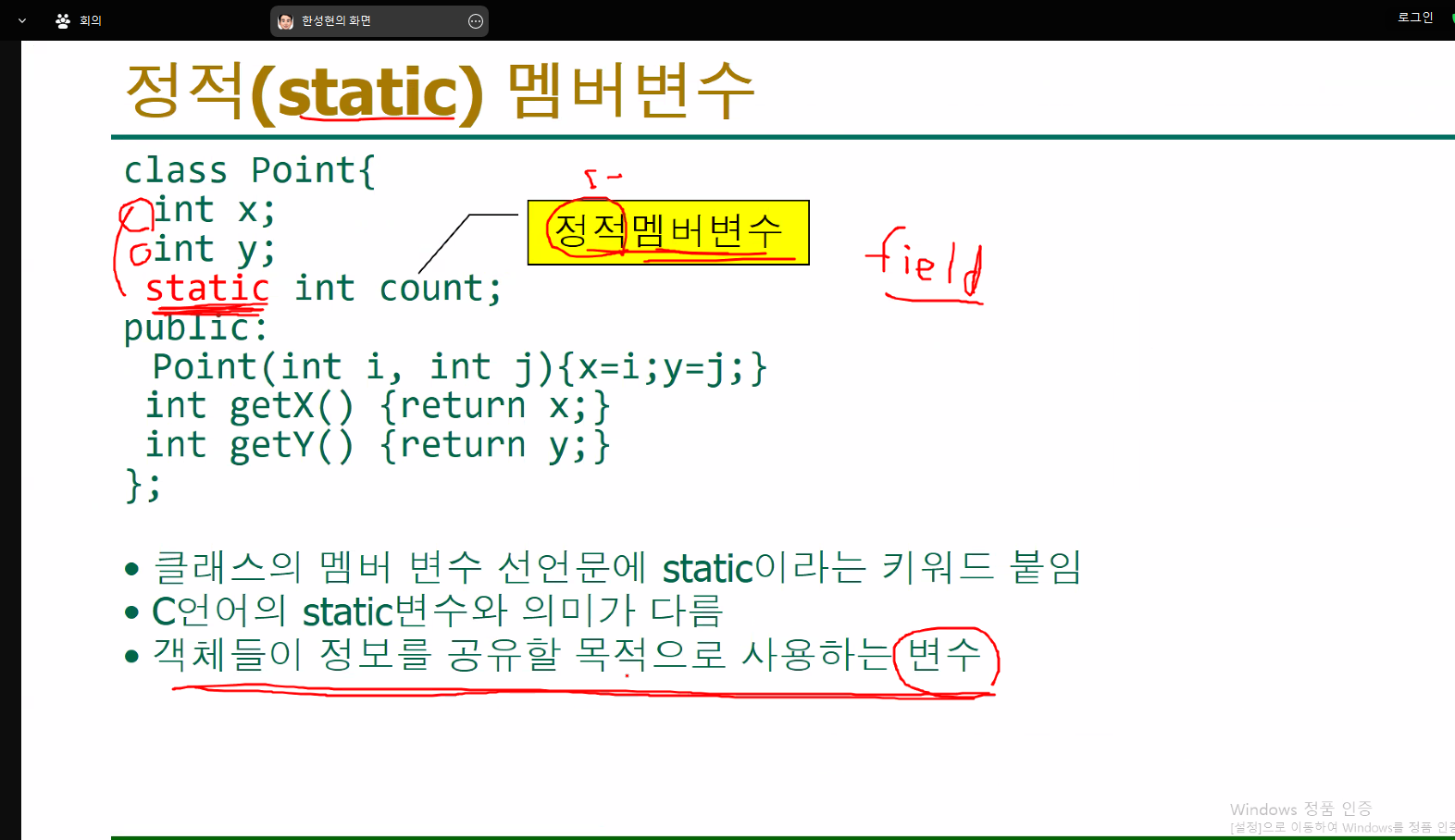 멤버변수중에static이 있는 변수를 정적멤버변수(static멤버변수)라고 한다. 이건, 멤버들이 객체들을 공유할 목적으로 사용하는 변수이다.*즁요)