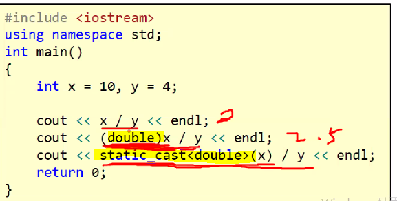 2가지 cast는 같은 방법이다. 요즘엔 밑에쪽static_cast<double>(x)를 많이쓴다. c++문법에서 사용한다.