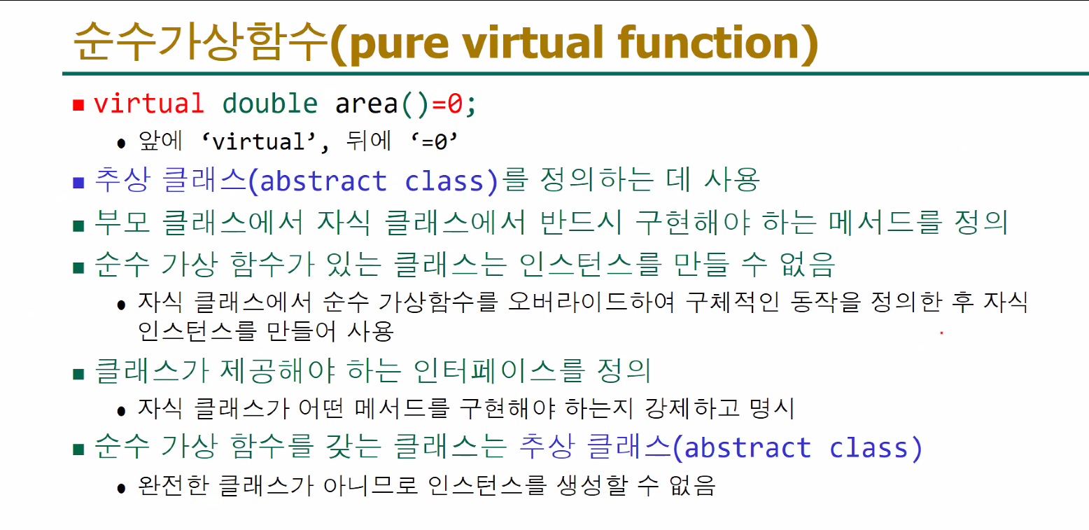 자식의 주소를 부모가 받을수 있다. 순수 가상함수는 추상클래스를 정의하는데 사용하고, 부모클래스에서