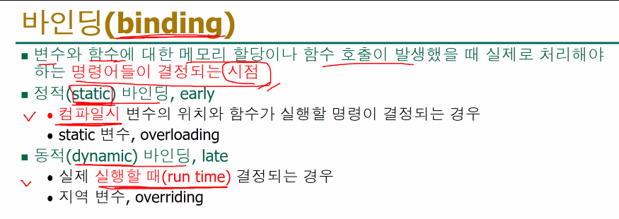 정적바인딩과, 동적바인딩.프로그래밍 언어에서 바인딩은 컴파일할떄 일어나는것인가?(static,early)바인딩 아니면 실행될떄 결정되는것은 동적(dynamic,late)바인딩 이다.