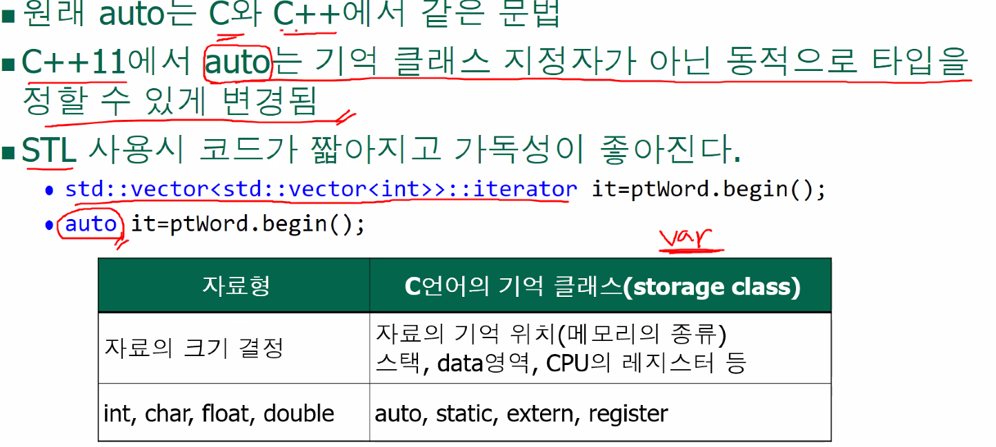 c++에선 auto가 동적으로 타입을 결정할 수 있는(자료형 자동 맞춤기능) 자료형이다.