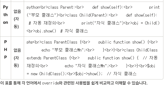 PHP에서는 override 키워드가 없지만, 부모 클래스의 메서드를 동일하게 정의하면 재정의됩니다.