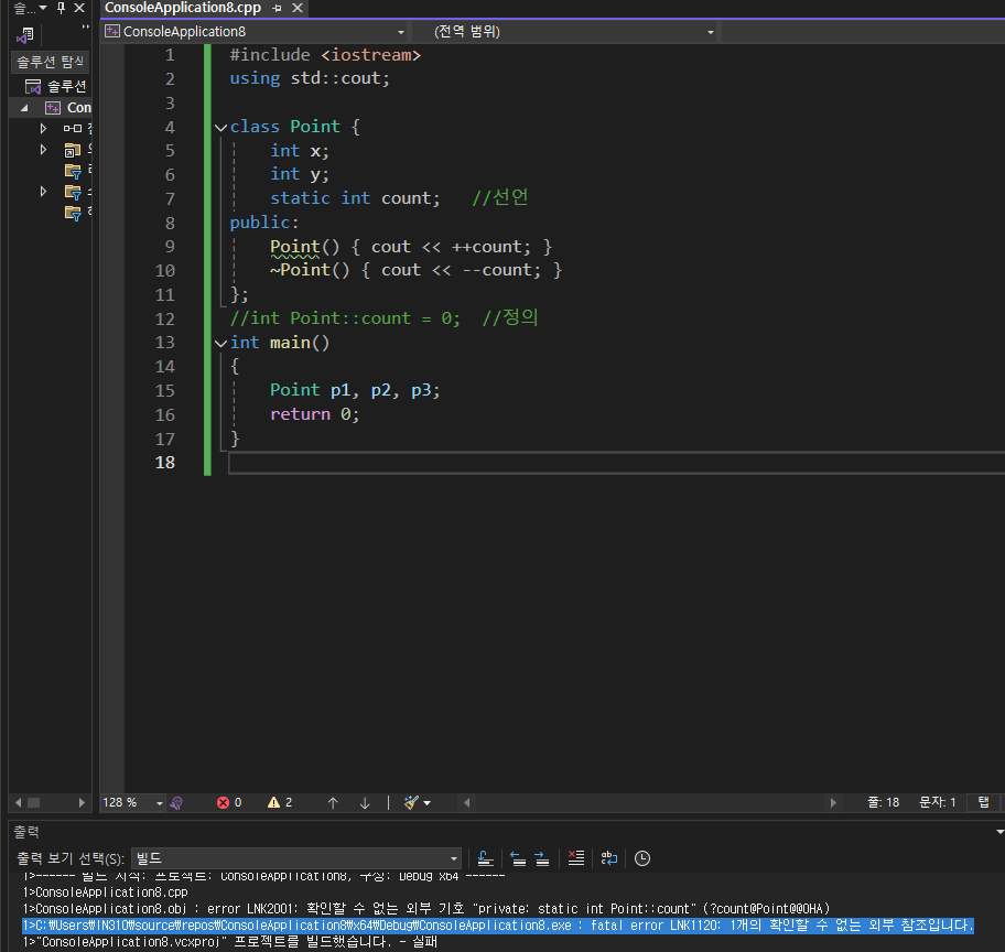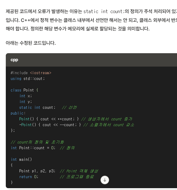 클래스 안에 넣기만 하는게 아니라, 클래스 밖에서 정의를해줘야 static을 쓸수있다.(정적멤버변수)