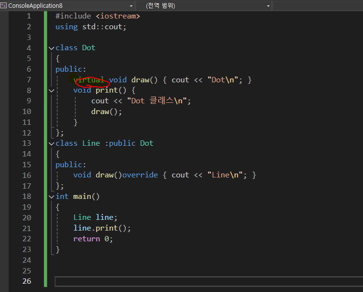 override 에선 만약virtual을 안쓰면 자식이 무시당하고 부모의것만 나온다. 하지만.virtual을 쓰면 자식의것이 나오게된다.\