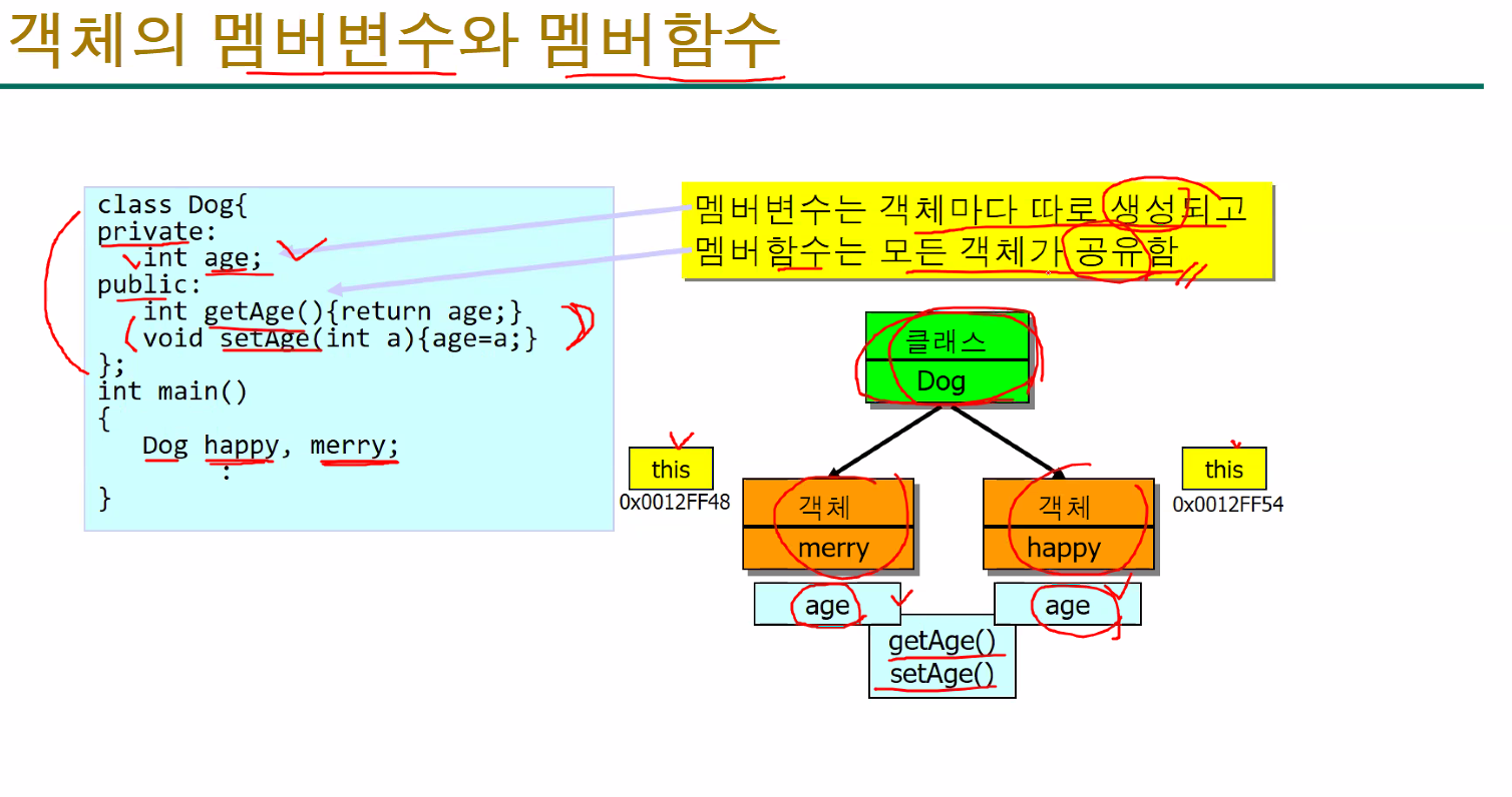 클래스로 부터 객체를 만들떄 멤버변수는 따로 만들어지고, 멤버함수는 모든객체가 공유한다.