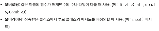 overloading 과overriding은 다른것이다. 오버로딩은 함수 이름이 같게여러개 사용이고, 라이딩은 자식 우선(시험나옴)