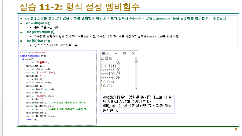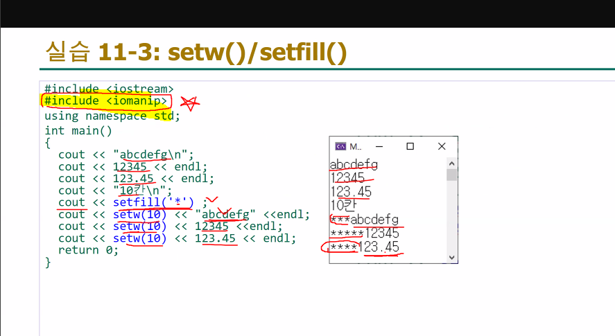 iomanip 이라는 헤더파일을 포함시켜야 밑의것을 쓸 수있다.(시험에 나옴)