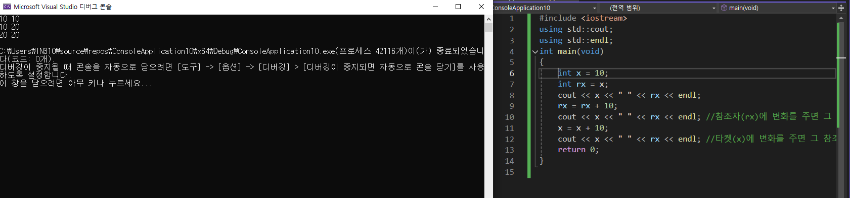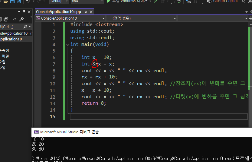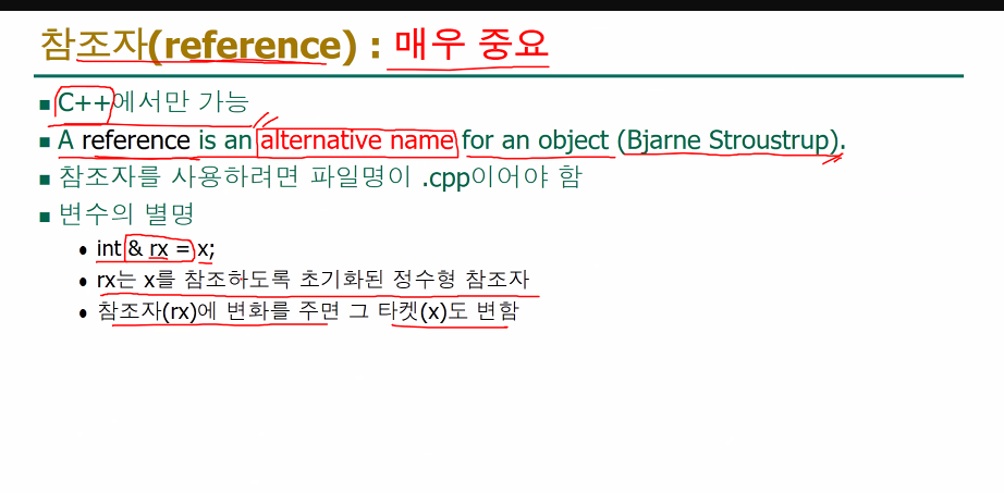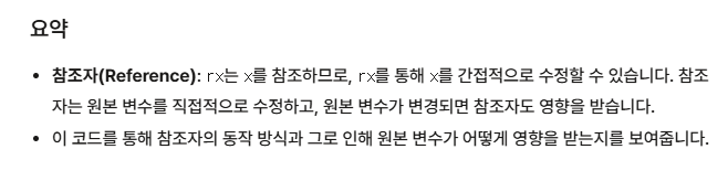 &를 쓰면, x의 별명으로 rx를 쓴다는 뜻이되서, rx가 바뀌면 x도 바뀌게 되어 값이 달라진것이다. (시험에 나올듯)참조자