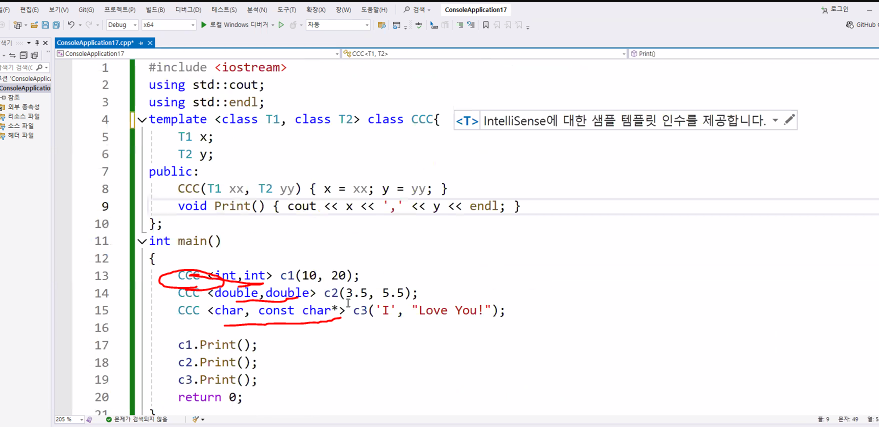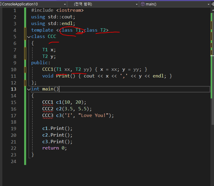 // 템플릿 클래스를 정의: T1과 T2라는 형식 매개변수를 가진 CCC 클래스
