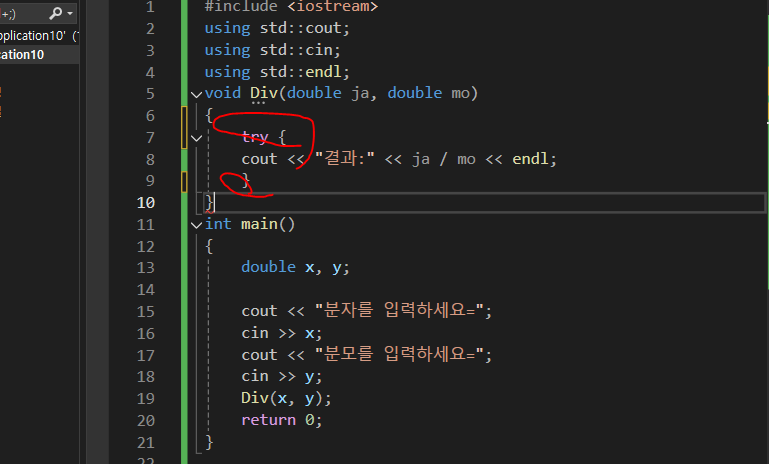1단계: 예외가 발생할 수 있는줄에 try{}블럭으로 묶는다.