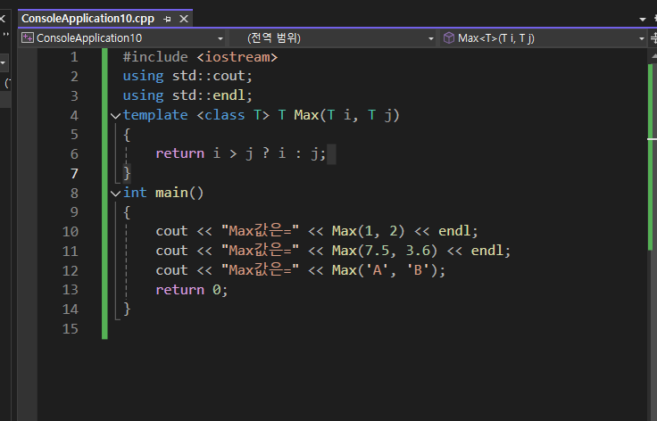 cout << "Max값은=" << Max(7.5, 3.6) << endl; // 결과: Max값은=7.5