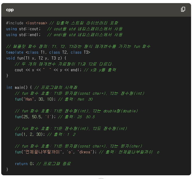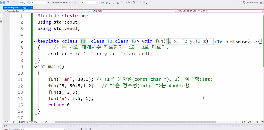 함수 중첩에서 여러자료형을 쓰지않고, 템플릿을 활용하여 소스를 고급지게 쓰는것이 가능하다