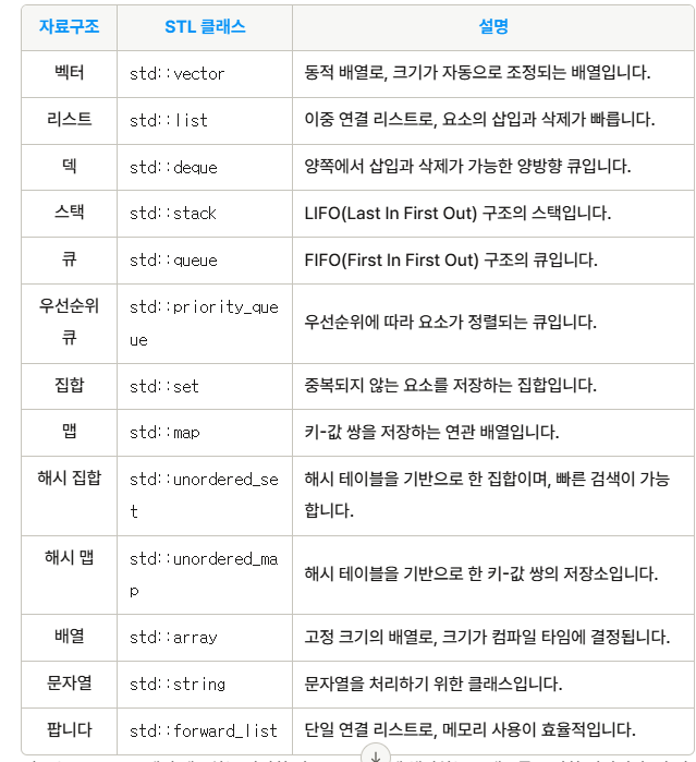 다양한 자료구조와 해당하는stl 클래스를 표로 작성해달라고 해보았다.